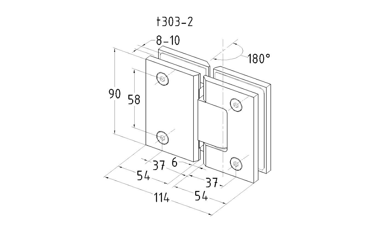 Петля из нержавеющей стали с полированной поверхностью предназначена для стыковки между собой конструкционных элементов из стекла, толщина которых находится в диапазоне от 8 до 10 мм. Максимальный вес двери на 2 петли составляет 45 кг. В конструкции заложена система скрытого крепежа. Имеет функцию доводчика до закрытия от 25°. Максимальный угол разведения стыковочных элементов в плане составляет 180°