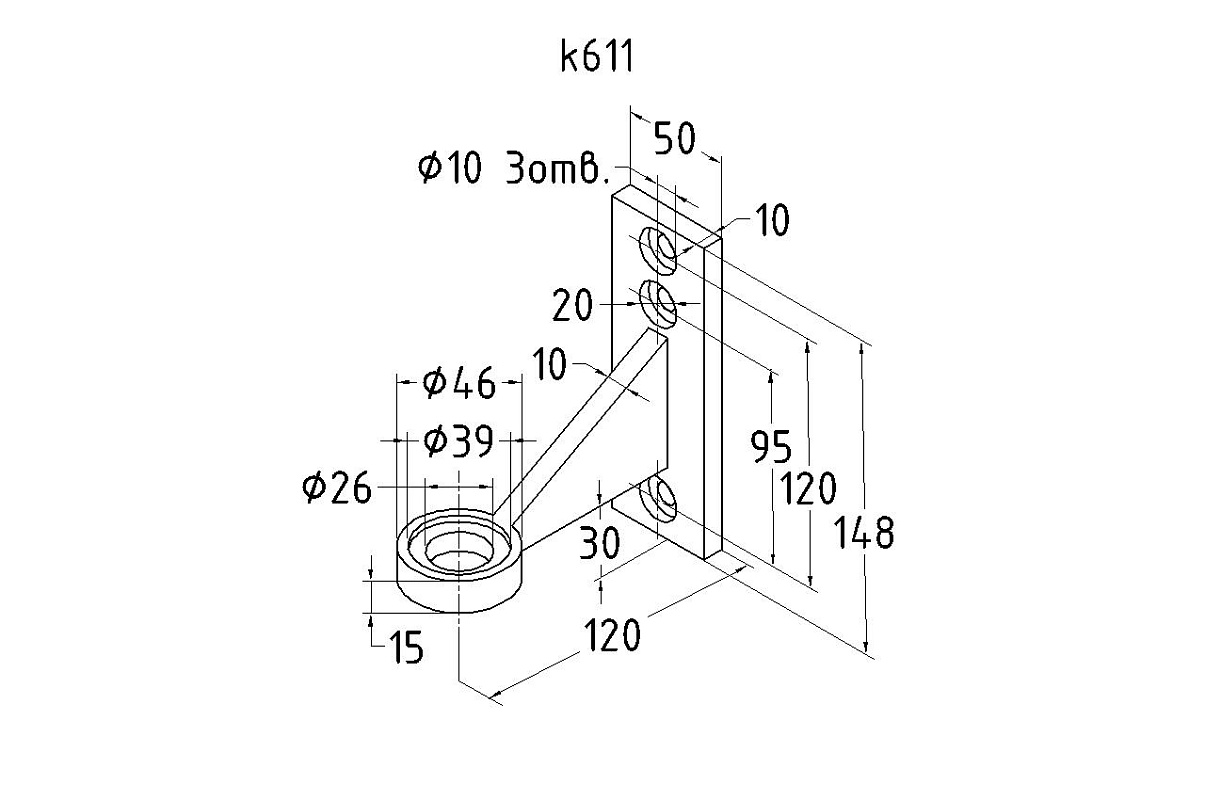 Держатель стеклянного козырька (Соединение стойка - рутель). Полированная деталь, выполненная из стали AISI 304. Состоит из фланса толщиной 10 мм и шириной 50 мм и дистансера с выносом 120мм до центра крепежного отверстия.На основании имеется 3 крепёжных отверстия.