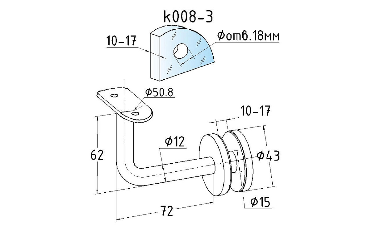 Держатель поручня Ø50.8 мм, на стекло 10-17 мм, Ø43х5 мм, вынос 60х70, нержавеющая сталь, полированная (AISI 304) k008-3