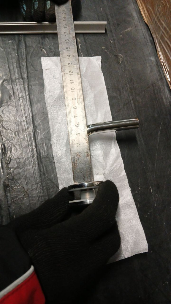 Для установки бокового держателя в стекле сверлится отверстие Ø17 мм, затем пристенок фиксируется затяжной гайкой в торце фланца. А сам поручень приваривается к загнутому наконечнику фитинга.