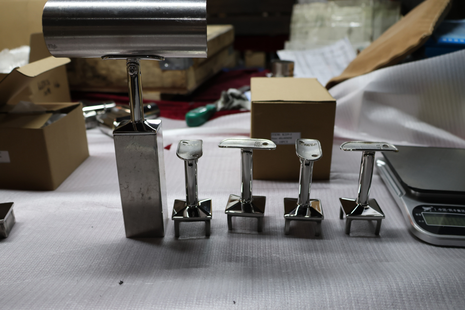 Наконечник палец на стойку из профильной трубы 40х40 мм, с регулируемым ложементом под поручень Ø50.8 мм, полированный, литой, облегченный нержавеющий AISI 304 k239-3