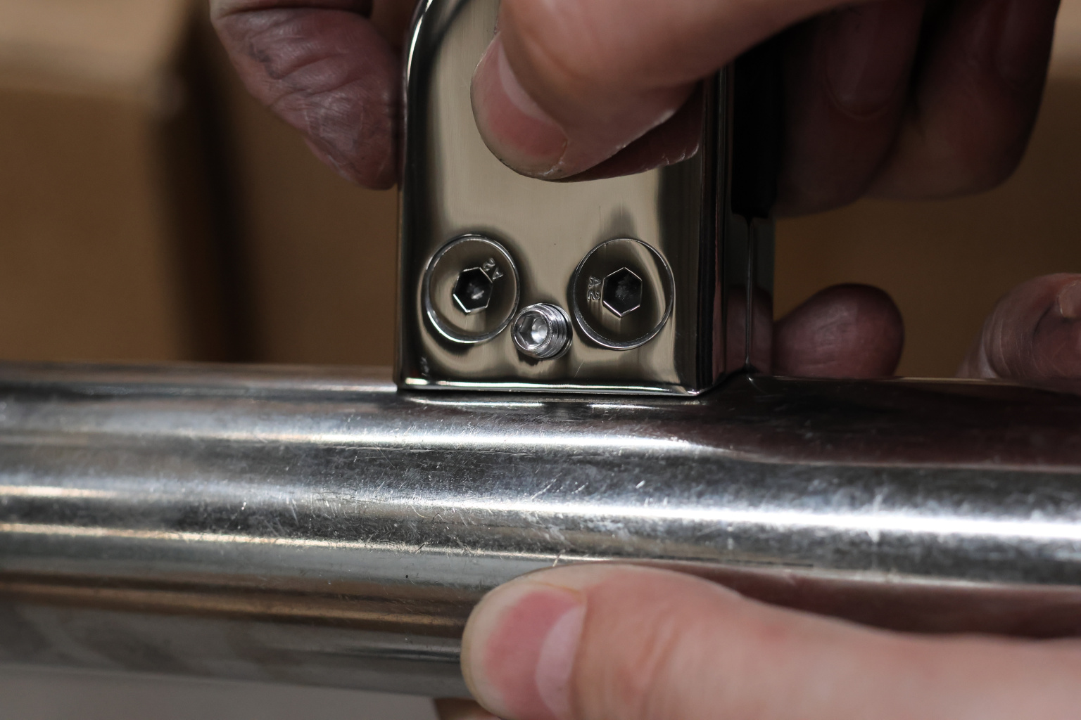 2. Либо вваривают шпильку с резьбой М6 и закрепляют первую половину стеклодержателя на стойке, стягивая гайкой. Вторая часть стеклодержателя присоединяется к первой входящими в комплект специальными винтами под шестигранный ключ. В этот момент стекло зажимается между двумя половинками детали специальными высокотехнологичными уплотнителями из EPDM.
