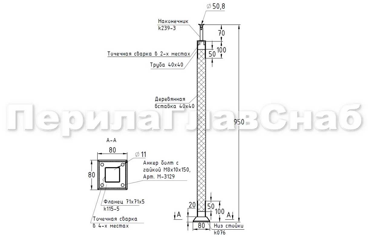 Готовая стойка 40х40х950 мм, деревянная буковая нелакированная, со вставками из нержавеющей стали полир. 2х100 мм k740-9-П