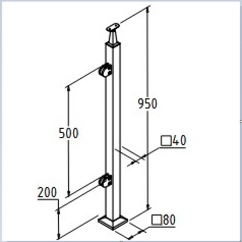 Стойка квадратная 40х40: 2 литых зажимн. стеклодержателя, шлифованная, высота 950 мм, марка стали- AISI 304