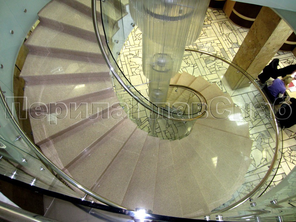 Крепление несущего моллированного (изогнутого) стекла было торцевым, относительно лестничного марша и атриума, а сверху, на выносах, к стеклу смонтирован полированный поручень из нержавеющей стали.