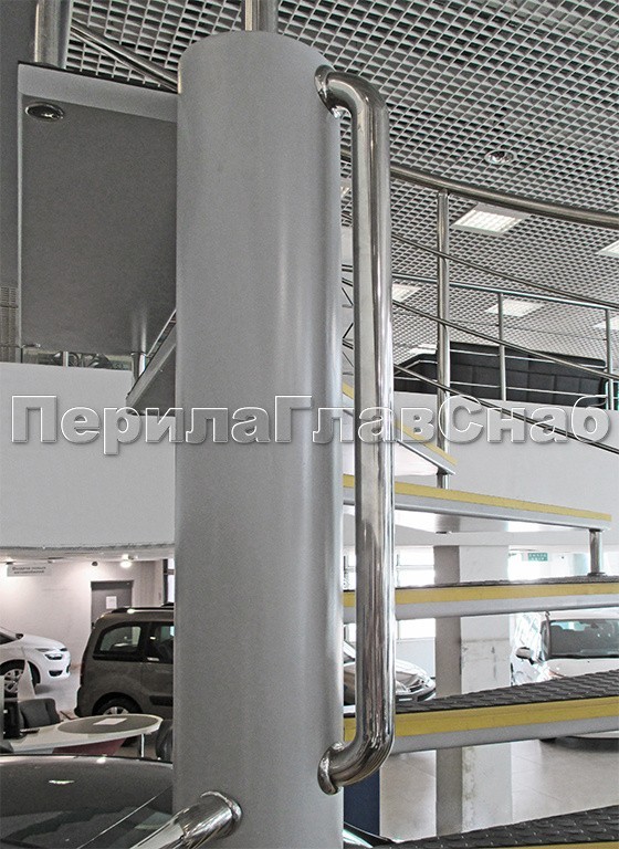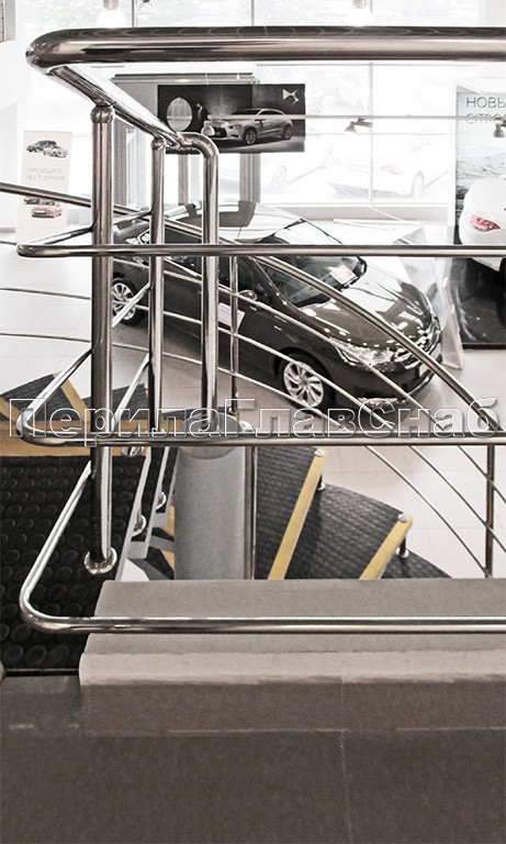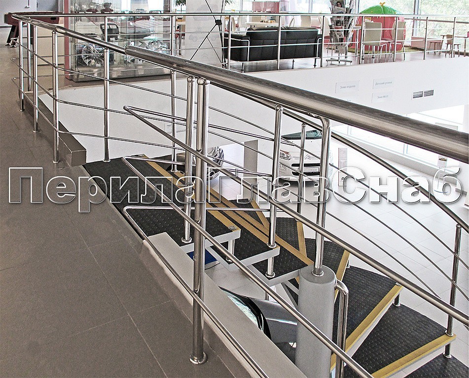 Ограждение из нержавеющей стали. Круглый поручень и стойки. Поручень крепится через полусферические наконечники.