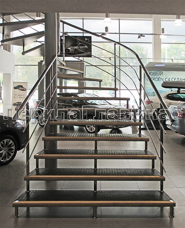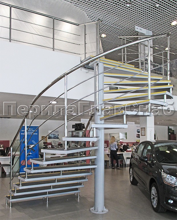 Круглая забежная лестница с ограждением из нержавеющей стали.