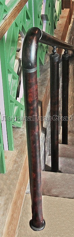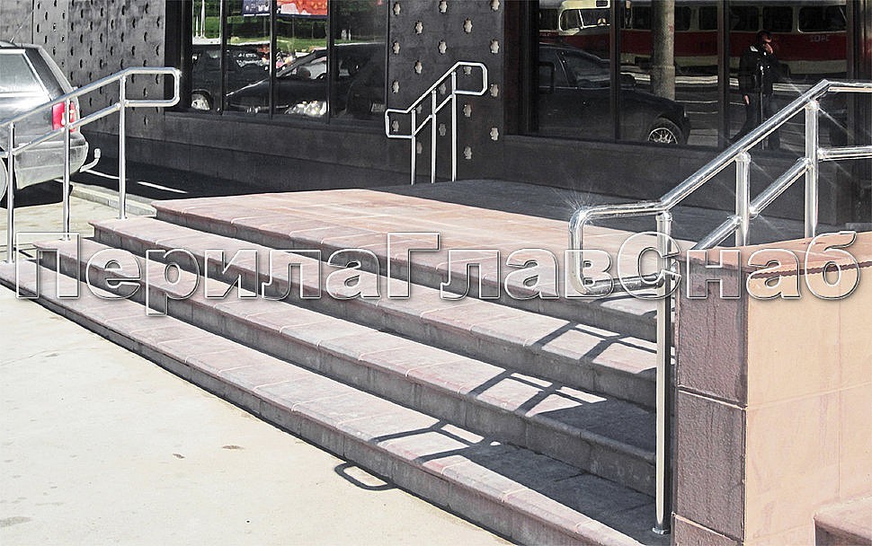 Уличное ограждение с бурением в пол. Заполнение стоек в каждую ступень. Поручень крепится через полусферический наконечник.