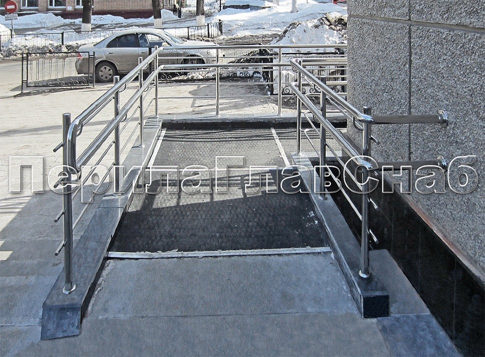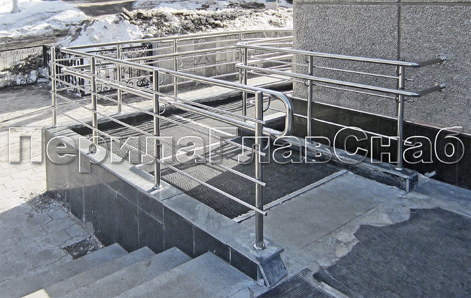 Двойной поручень, сделанный специально для людей с ограниченным возможностями в передвижении. Стойки ограждения сделаны из нержавеющей стали.