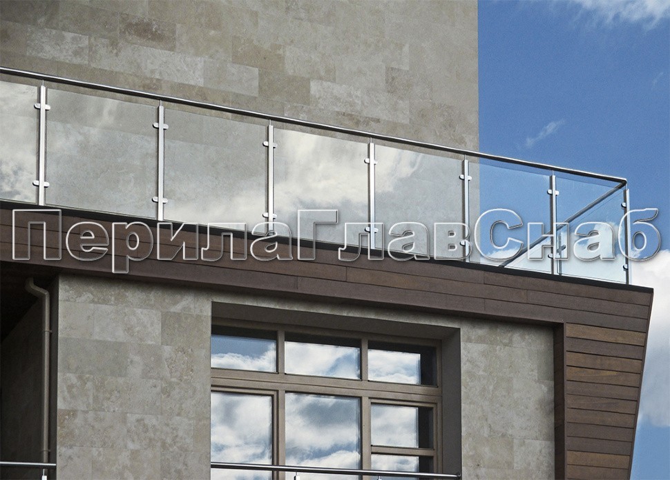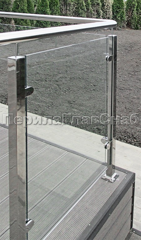 Ограждение со стеклянным заполнением. Квадратные стойки из нержавеющей стали. Круглый поручень крепится к стойкам через наконечник типа "палец".