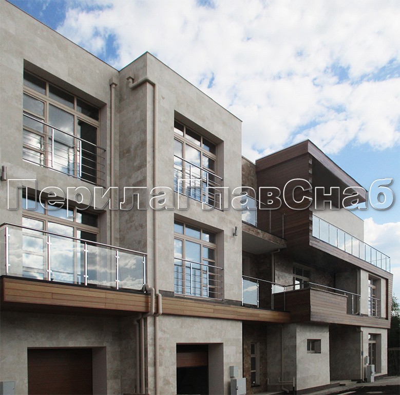Экстерьер здания со стеклянными ограждениями.