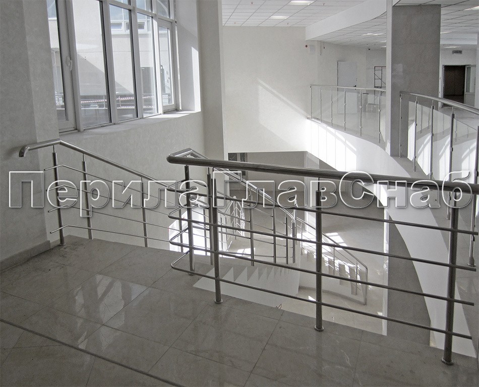 Круглые стойки ограждения с ригельным заполнением. Крепление поручня через регулируемый ложемент.