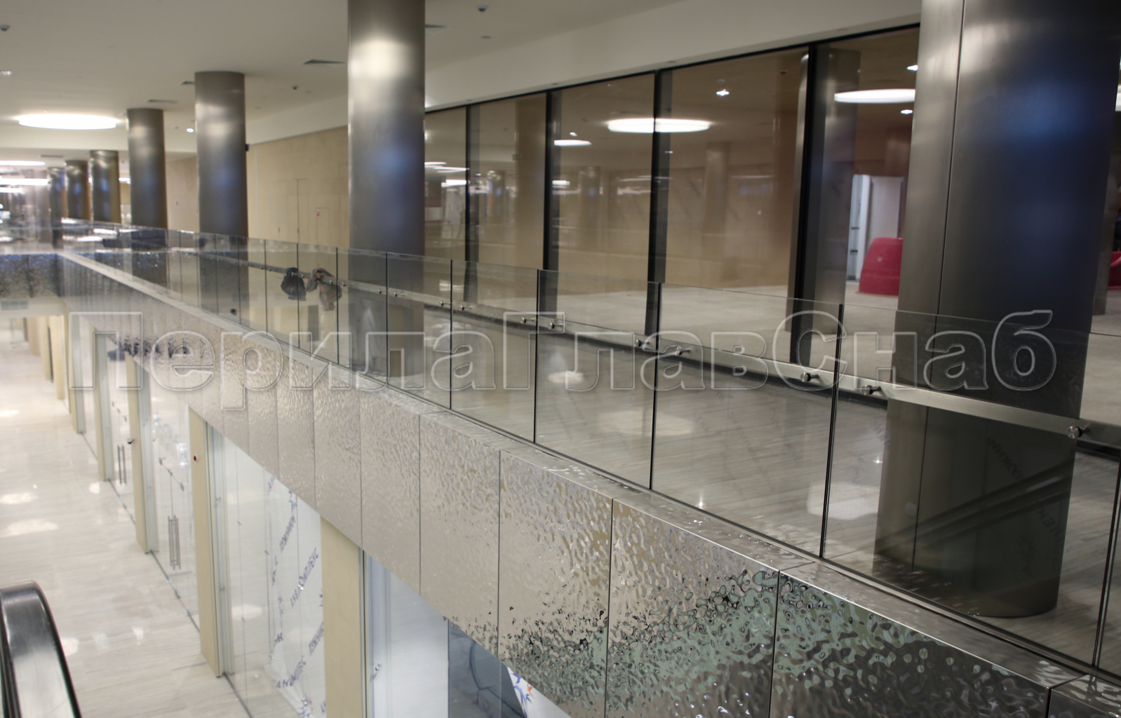 Так же на данном объекте нами были установлены ограждения из полированной нержавеющей стали конструктив которых состоял из стойки диаметром 38мм, двойного поручня такого же диаметра, завязанного между собой с заполнением между стоек сеткой. Сетка была смонтирована точечной сваркой. Каждый пучок тросов приваривался после натяжения к металлической конструкции, что потребовало кропотливой и трудоемкой работы монтажников. Все сварные швы ограждения так же были зачищены и заполированы.