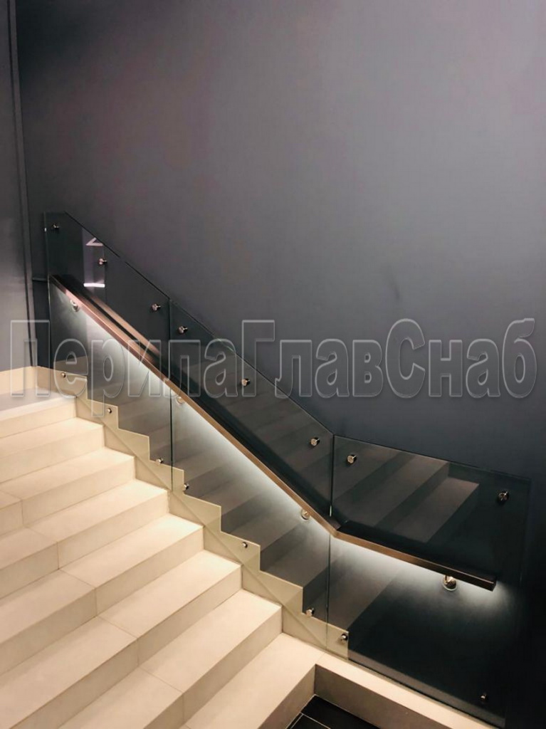 Конструктив:  профильная  труба  40х40 мм с  пазом  и встроенной  ЛЭД подсветкой, пристенные  держатели, стекло