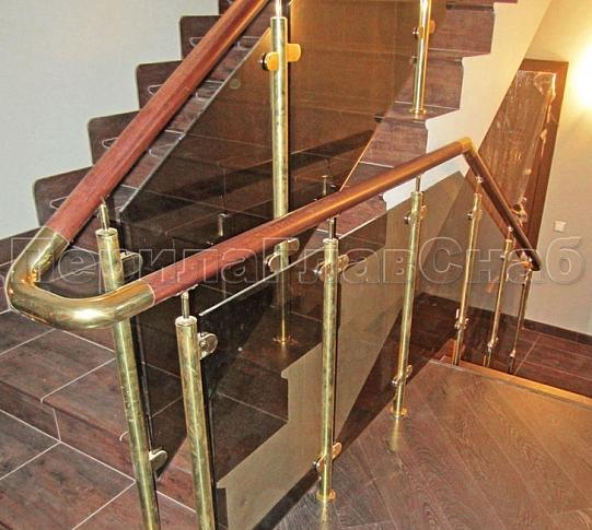 - Ограждение лестницы со стеклом, тонированным в массе, стойки и завязки поручня из латуни